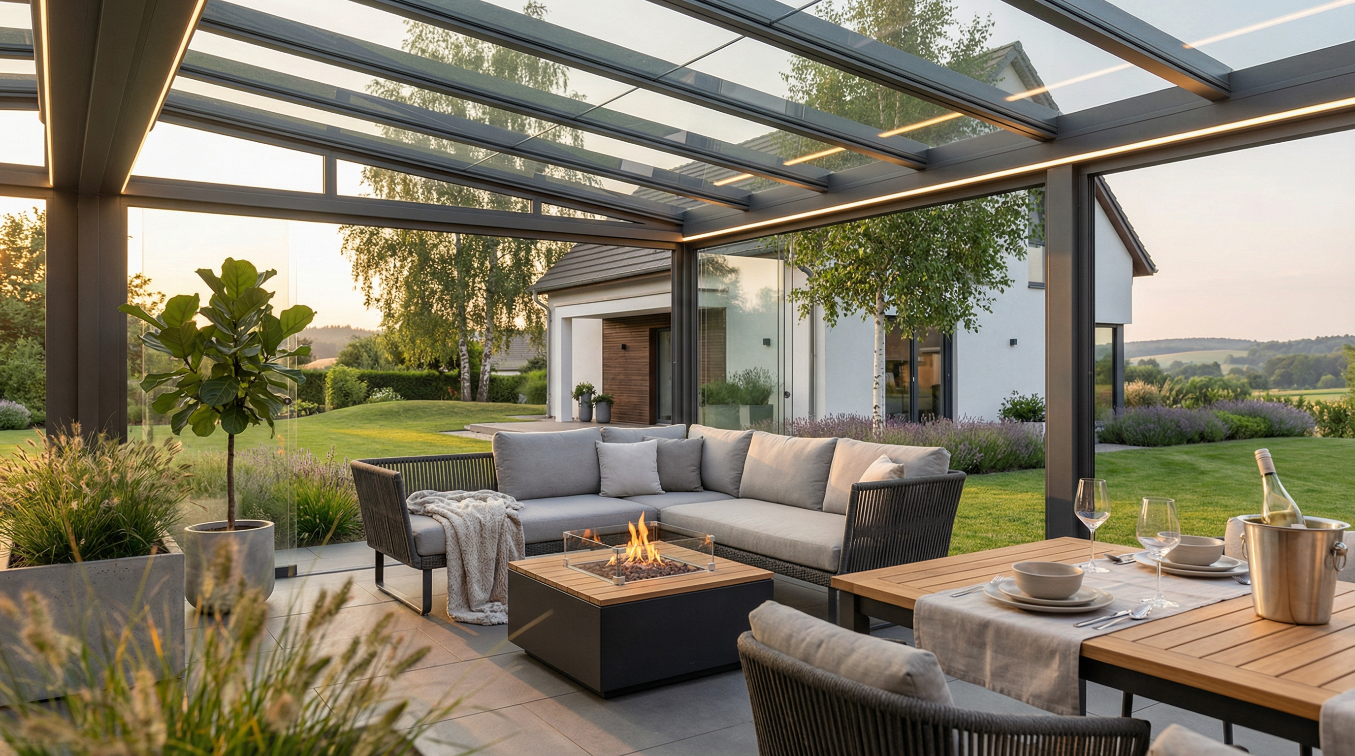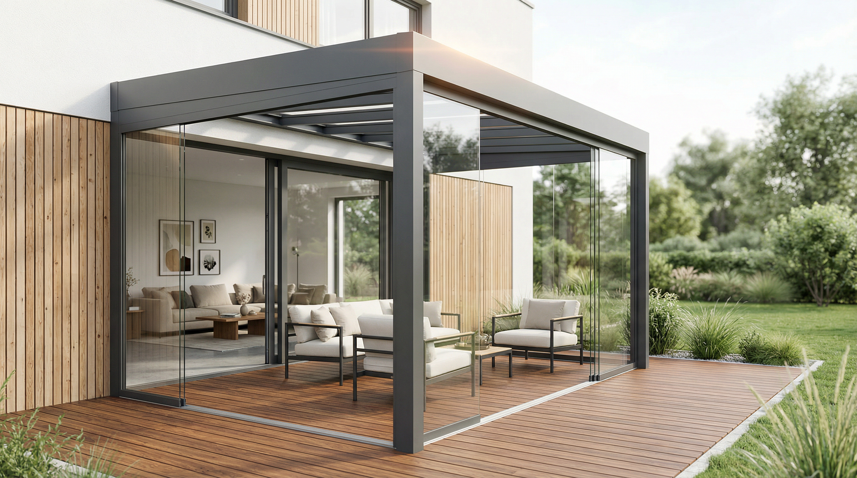 Verwandeln Sie Ihr Terrassendach in einen vollständig geschlossenen Raum – flexibel öffenbar bei schönem Wetter.